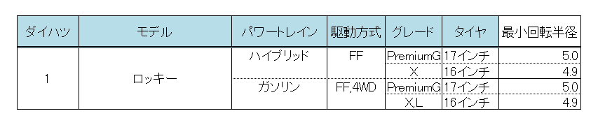 ダイハツの登録車はロッキーのみとなります。なかでも16インチタイヤ採用モデルが4.9mで最も最小回転半径の小さいSUVとなります。