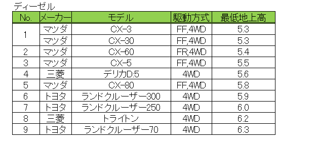 一方でディーゼルエンジンは本格的な4WD車に多く採用されており、先述したランドクルーザーシリーズが多くラインナップするなかランドクルーザー300が6.3mでワーストとなります。