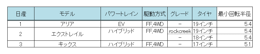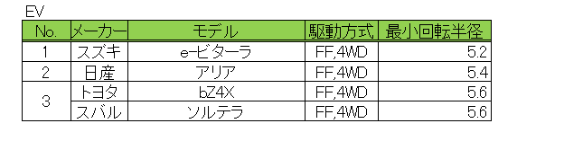 逆に最も最小回転半径が大きいのはEVのソルテラとなります。