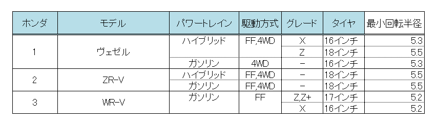 | ホンダ | ヴェゼル、WR-V、ZR-V |