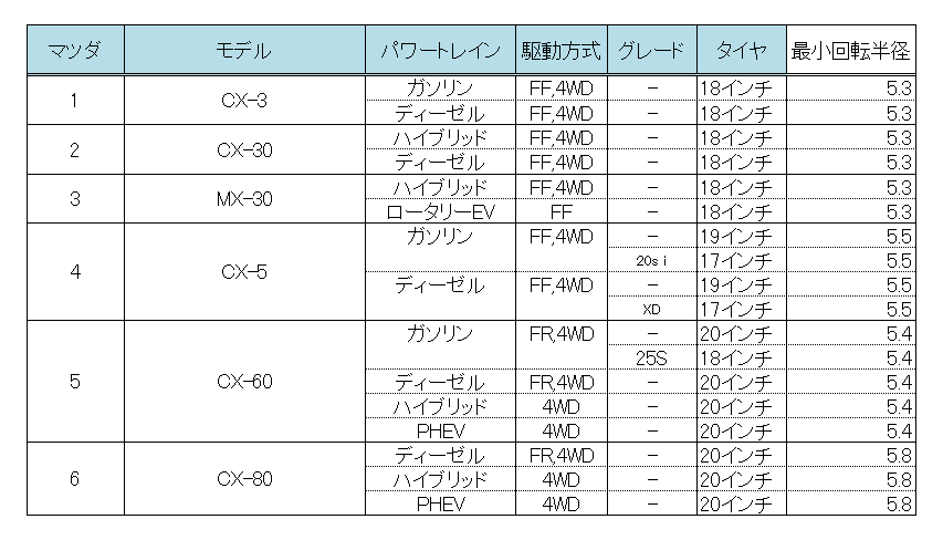 | マツダ | CX-3、CX-30、MX-30、CX-5、CX-60、CX-80 |