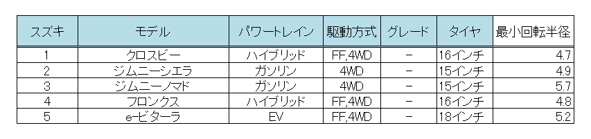 国内のSUVで最も最小回転半径が小さいのは、スズキ・クロスビーの4.7mという結果になりました。