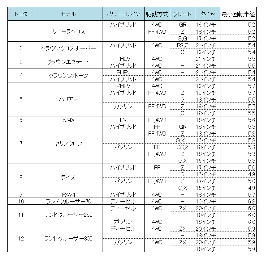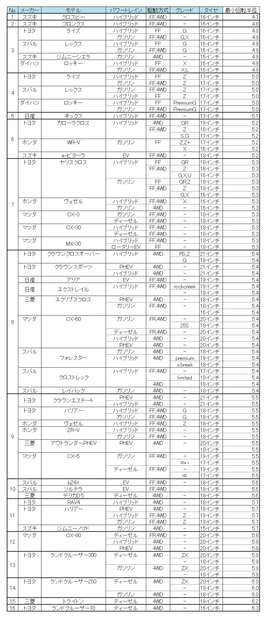 メーカーが公表している「最小回転半径」をベースに比較として駆動方式、パワートレイン、グレード、タイヤサイズごとに一覧にしています。
